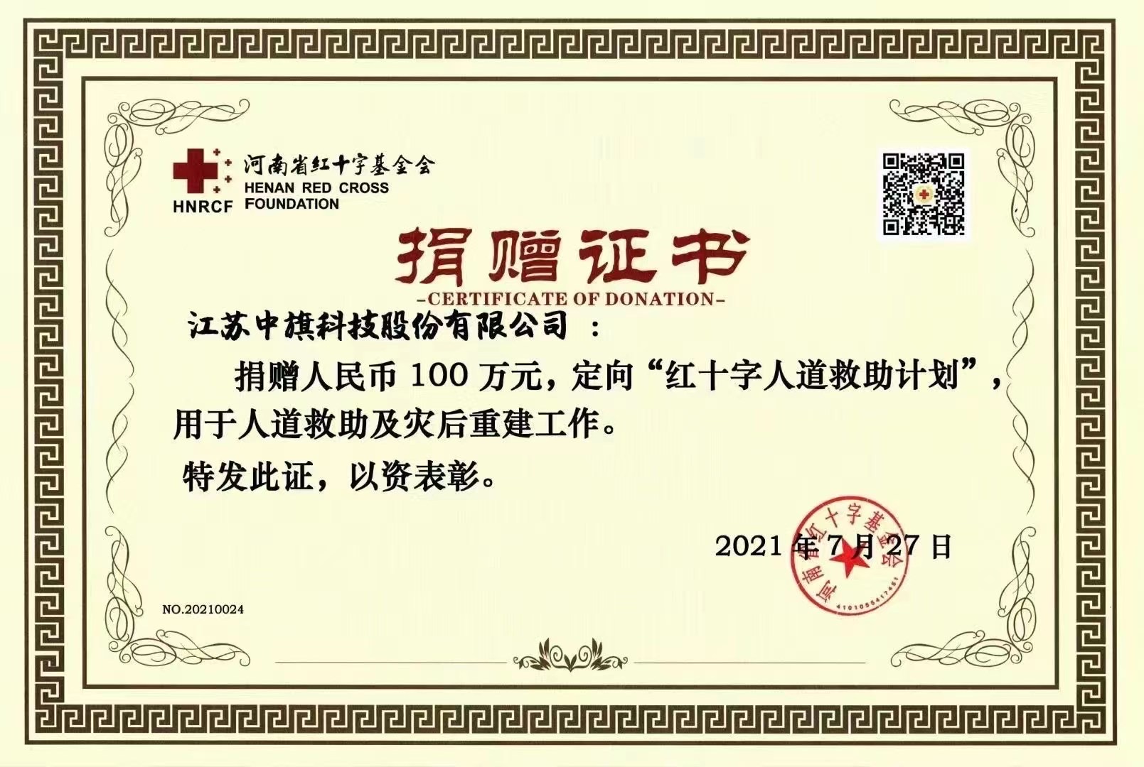 中旗科技心系災區(qū),經(jīng)董事會決議通過向河南省紅十字基金會捐贈100萬元,定向“紅十字人道救助計劃”。